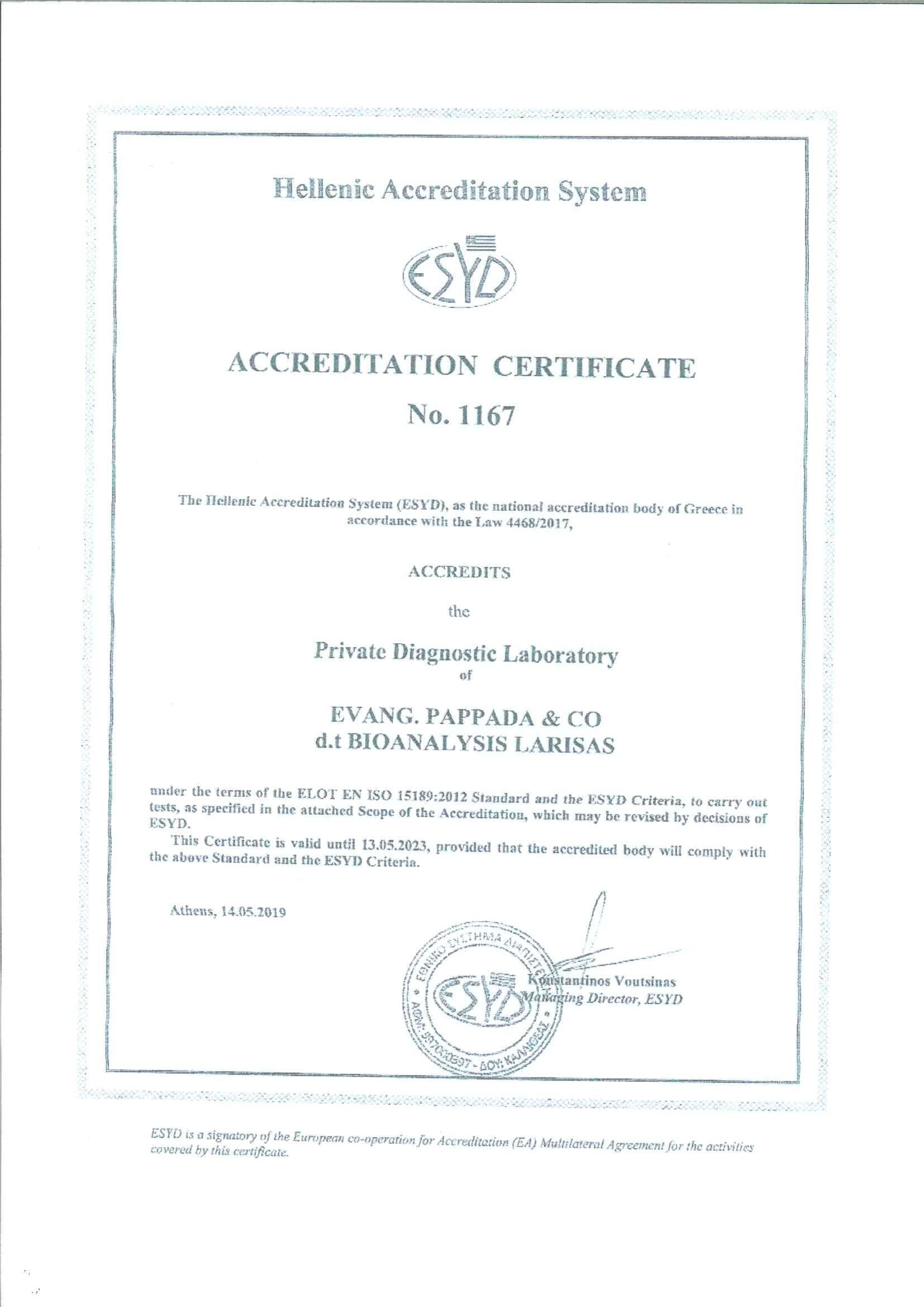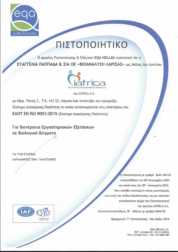 "Η ΒΙΟΑΝΑΛΥΣΗ ΛΑΡΙΣΑΣ έχει πιστοποιηθεί κατά ISO